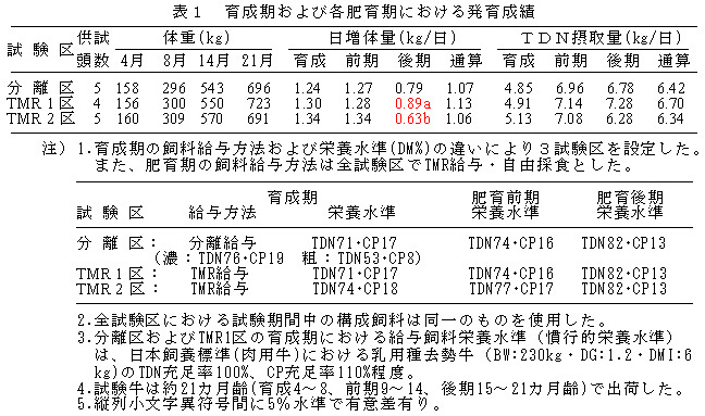 - 育成期にTMR(TDN71%・CP17%)を給与した乳用種去勢肥育牛は、肥育期間中の増体、枝肉成績が優れる。また、育成期および肥育前期に栄養水準を高めたTMR(育成期TDN74%・CP18%、肥育前期TDN77%・CP17%)を給与した乳用種去勢肥育牛は、肥育後期の飼料摂取量および日増体量が低下する。