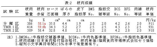 慣行的栄養水準のTMR給与により育成した乳用種去勢肥育牛の枝肉成績は、分離給与により育成した場合と比較して、枝肉重量、歩留、バラ厚および脂肪交雑等級に優れる傾向があり、枝肉単価は高くなる(表2)。