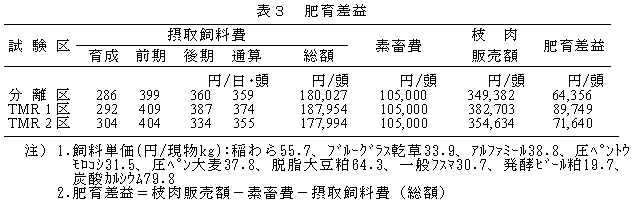 慣行的栄養水準のTMR給与により育成した乳用種去勢肥育牛は、分離給与または栄養水準を高めたTMR(TDN74%・CP18%)給与により育成し、高栄養水準で肥育を継続した場合と比較して、枝肉販売額が高く、肥育差益は向上する(表3)。