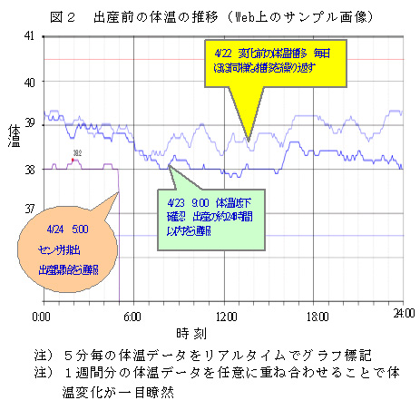 1)出産を控えた乳牛33頭の連続体温データを解析した結果、出産前に有意な体温低下を始める時間は、娩出の平均24時間56分前であった(表1、図1)。また、破水等で温度センサが体外に排出されてから娩出までの時間は平均で43分であった(表2)。このように出産前の連続体温の解析結果より、24時間以内に出産する可能性が高いことを飼養者へ通報し、次に破水等の出産が開始したことを通報するシステムを開発(図2)。