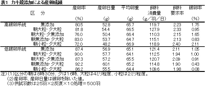産卵後期(420日齢〜560日齢)では鶏の銘柄、カルシウム源の違いを問わず、夕方に大粒のカキ殻や卵殻粉を給与すれば破卵率の低減や産卵率、産卵日量の向上が期待できる。(表1、表2、図1)