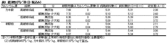 経済性においても産卵後期では鶏の銘柄、カルシウム源の違いを問わず、夕方に大粒のカキ殻や卵殻粉を給与すれば、収支差で有利である。(表3)