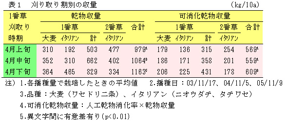 1番草の大麦は水熟期頃に乾物消化率が低くなるが、子実が充実してくると向上し、一方のイタリアンライグラスは生育が進むほど低くなる。その結果、1番草全体としては4月下旬に収穫した場合の乾物消化率はやや低くなる(表3)。