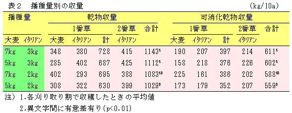 混播する播種量はイタリアンライグラス3kg/10aに大麦5〜7kg/10a、又はイタリアンライグラス2kg/10aに大麦7kg/10aとすると、1、2番草合計の乾物収量、可消化乾物収量ともに高くなる(表2)。