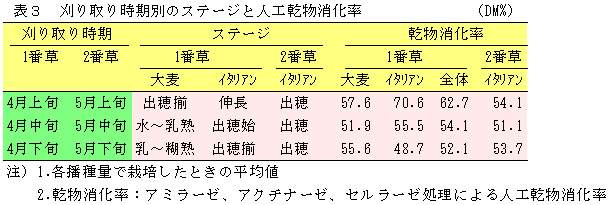 表3 刈り取り時期別のステージと人工乾物消化率(DM%)