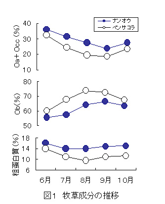 - バヒアグラス「ナンオウ」草地(1ha)に黒毛和種母子牛4組を6月〜10月まで補助飼料無給与で輪換放牧を実施した。対照草地としてバヒアグラスの2倍体品種「ペンサコラ」草地(1ha、黒毛和種母子牛4組)を用いた。施肥量は両草地とも5月、7月、9月にN:P2O5:K2Oの各成分3.8kg/10aである。バヒアグラスの4倍体品種「ナンオウ」は従来の2倍体品種「ペンサコラ」に較べ、粗蛋白質およびOa(高消化性繊維)+Occ(細胞内容物質)含量は放牧期間中、常に高い値で、Ob(低消化性繊維)含量は低い値で推移し、良好な草質を示す(図1)。