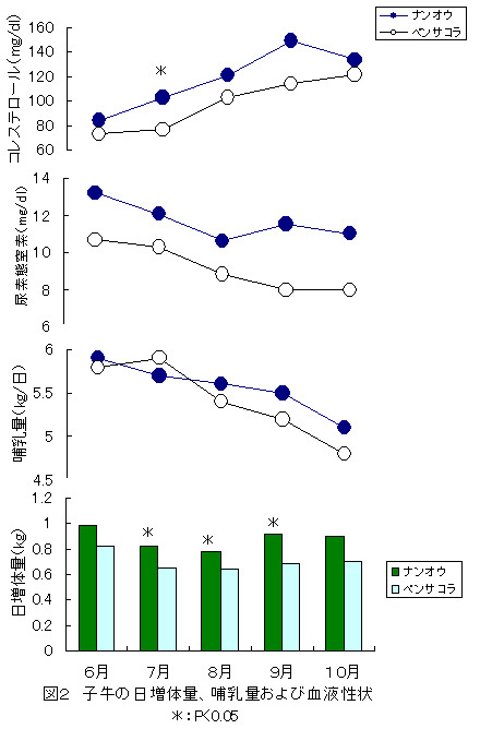 ナンオウ区の放牧子牛は夏期においても日増体量0.8kg以上の良好な発育を示し、生時〜離乳(4か月齢)までの日増体量はペンサコラ区の0.69kgに対して、ナンオウ区は0.84kgと有意に高い値である。哺乳量は両区にほとんど差異は見られない(図2,表1)。