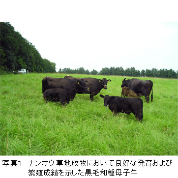 写真1 ナンオウ草地放牧において良好な発育および繁殖成績を示した黒毛和種母子牛