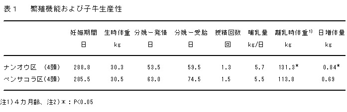 ナンオウ区の母牛の繁殖成績は分娩〜発情および分娩〜受胎間隔は53.5日、59.5日、受胎に要した授精回数も平均1.3回とペンサコラ区より良好な成績であり、十分、連産が可能な繁殖成績を示す(表1)。