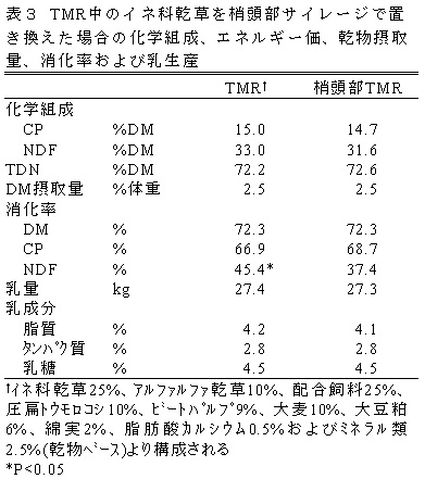 表3 TMR中のイネ科乾草を梢頭部サイレージで置き換えた場合の化学組成、エネルギー価、乾物摂取量、消化率および乳生産