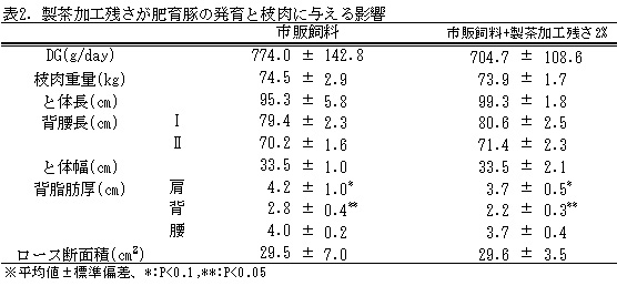 - 肥育後期(70kg〜と畜)に製茶加工残さを市販の肥育後期飼料に外付けで2%混合して給与することにより背脂肪厚が有意に薄くなる(P<0.05)。DGや枝肉重量、背腰長など発育や枝肉成績に製茶加工残さ2%給与による悪影響は見られない(表2)。