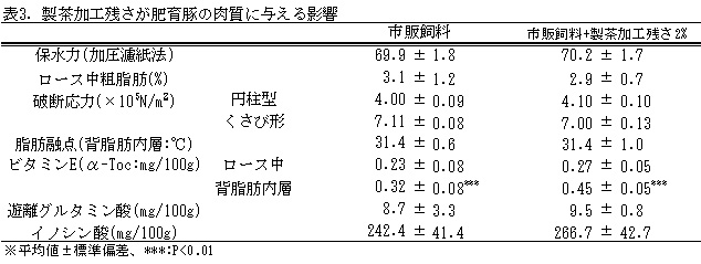 - 肥育後期(70kg〜と畜)に製茶加工残さを市販の肥育後期飼料に外付けで2%混合して給与することにより脂肪中のビタミンEが有意に増加する(P<0.01)。保水力や脂肪融点などの肉の理化学的性状に製茶加工残さ2%給与による悪影響は見られない(表3)。
