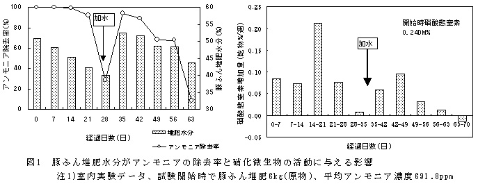 豚ふん堆肥にアンモニアを送入した場合の除去率は豚ふん堆肥の水分に影響を受け、水分40%以上であれば60%以上のアンモニア除去率を示し、通気に伴って乾燥した場合にも加水を行えば除去率を維持できる。また、豚ふん堆肥中の硝化微生物も水分によって影響を受け、水分が低下するとアンモニア態窒素の硝化作用が低下する(図1)。