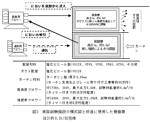通常の通気型堆肥舎を改造し、豚ふん堆肥とオガクズを乾物重量比で1:0.75程度に混合し、定期的な切り返しを行って全体の水分を均一な状態で40%以上に維持することで、同体積の豚ふん堆肥発酵時の臭気についての実証規模の脱臭槽とすることが可能である(図3)。