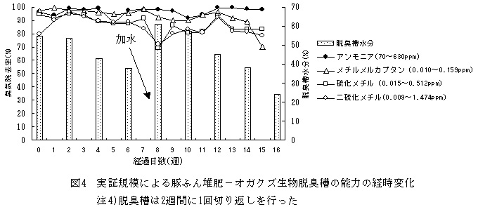 図4 実証規模による豚ふん堆肥ーオガクズ生物脱臭槽の能力の経時変化