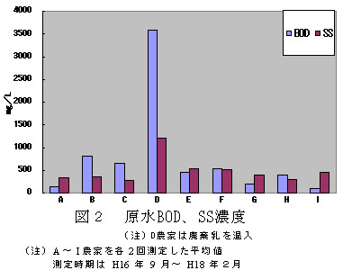 原水のBODとSS濃度は、廃棄乳を混入しなければBODが1,000mg/L未満、SSが500mg/L未満であり、尿汚水処理と比べて低濃度であるため無希釈で曝気処理可能と考えられる。(図2)