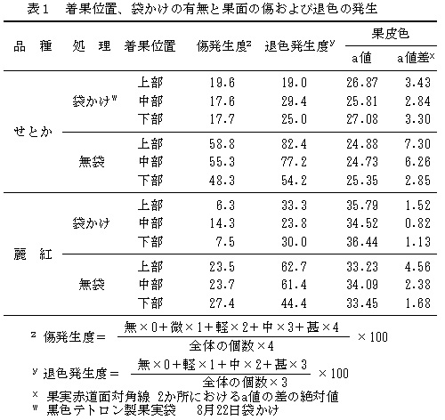 表1 着果位置、袋かけの有無と果面の傷および退色の発生