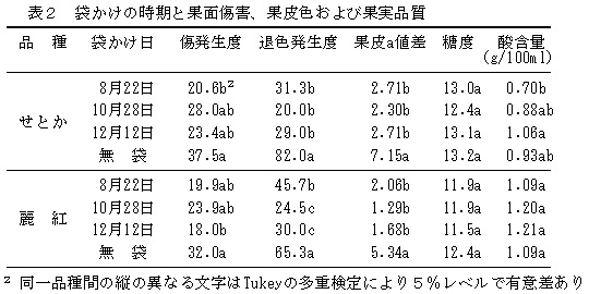表2 袋かけの時期と果面傷害、果皮色および果実品質