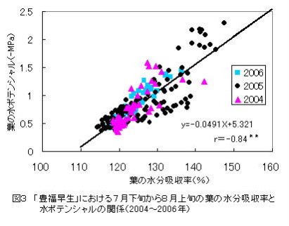 図3 「豊福早生」における7月下旬から8月上旬の葉の水分吸収率と水ポテンシャルの関係
