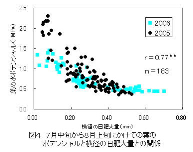 図4 7月中旬から8月上旬にかけての葉のポテンシャルと横径の日肥大量との関係