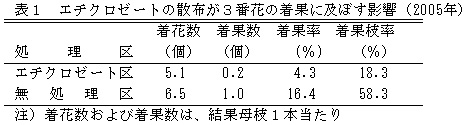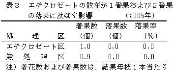 表3 エチクロゼートの散布が1番果および2番果の落果に及ぼす影響(2005年)