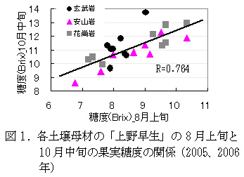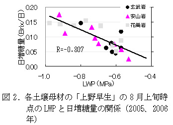 図2 各土壌母材の「上野早生」の8月上旬時点のLWPと日増糖量の関係(2005、2006年)