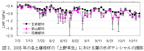 図3 2005年の各土壌母材の「上野早生」における葉の水ポテンシャルの推移