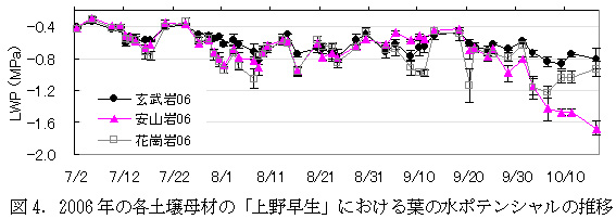 図4 2006年の各土壌母材の「上野早生」における葉の水ポテンシャルの推移