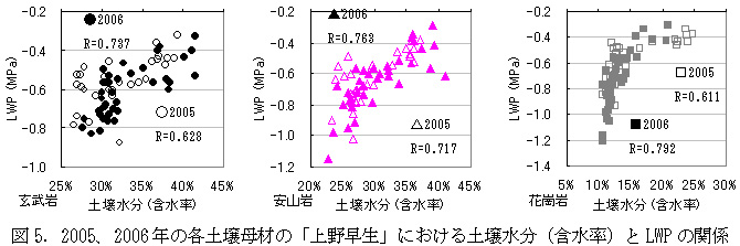 図5 2005、2006年の各土壌母材の「上野早生」における土壌水分(含水率)とLWPの関係