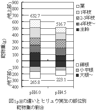 図1 pHの違いとヒリュウ実生の部位別乾物重の割合