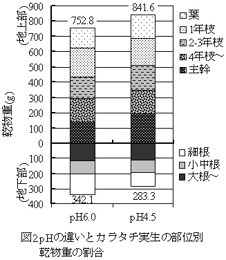 「カラタチ」のpH4.5条件下での乾物重は、地下部ではpH6.0条件下と比較して20%程度低下するが、地上部ではpH6.0条件下と同程度以上である(図2)。