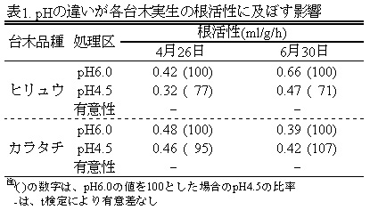 表1 pHの違いが各台木実生の根活性に及ぼす影響