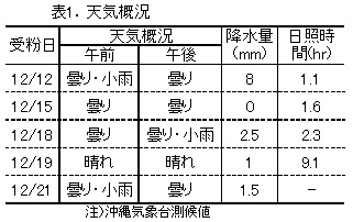 紫系パッションフルーツは自家受粉で結実するが、曇天や雨天等では結実率が極端に低下する。特に沖縄県において、パッションフルーツの夏実生産の開花期間である冬期から春にかけて天候不順日が多いため、結実率が低下し、収量低下の要因になっている。そこで、他家受粉による結実安定法を検討する。