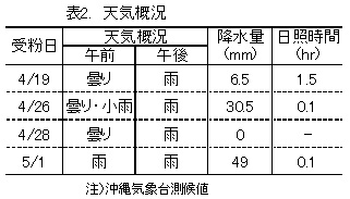 紫系パッションフルーツの自家受粉は、晴天日の受粉では結実率は高いが、曇天、雨天日には著しく低下する(表1、表2、表3、表4)。