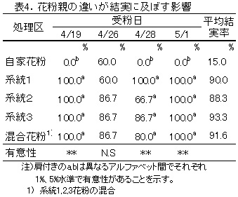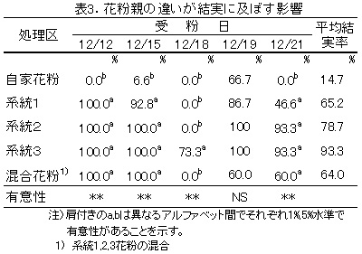 系統3の花粉の受粉により、商品価値の高い出荷規格でM以上の果実が生産される(表5)。