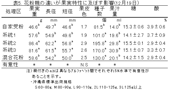表5 花粉親の違いが果実特性に及ぼす影響(12月19日)