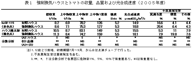 表1 強制換気ハウスとトマトの収量、品質および光合成速度(2005年度)
