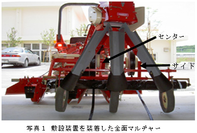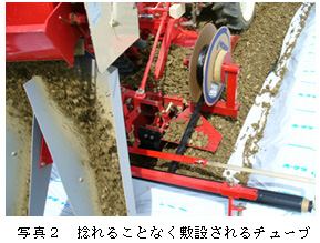 - 畦立てマルチとマルチ内チューブ敷設の同時作業を可能にするために、二畦同時成形型全面マルチャーにチューブロールを固定する装置を製作した。それによりチューブ敷設時間が大幅に短縮され、軽労・省力化が図れる。