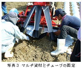 畦立てマルチ開始時に、マルチ資材とチューブの端を同時に畦の起点に固定するだけでよく(写真3)、従来のマルチャー使用時と同人数で対応でき、畦立てマルチそのものの作業性・能率に影響はない。
