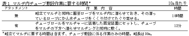10アールのマルチ内チューブ敷設作業に、アタッチメントが無い場合は18時間を要するが、本装置を用いると12分に短縮され、軽労・省力化が図れる(表1)。