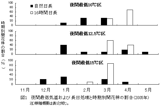 で加温することで3〜4月に出荷できる。また、長日処理により、開花株率は高くなり、品質が向上する。