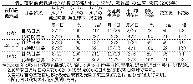 表1 夜間最低気温および長日処理とオンシジウム「流れ星」の生育・開花(2005年)