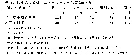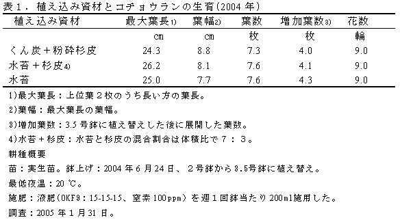 コチョウランの栽培において、植え込み資材としてくん炭+粉砕杉皮を使用すると、慣行の水苔+杉皮と同等に生育する(表1、表2)。