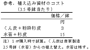 - くん炭+粉砕杉皮は慣行の水苔+杉皮に比べて1/5の低コスト資材である(参考)。