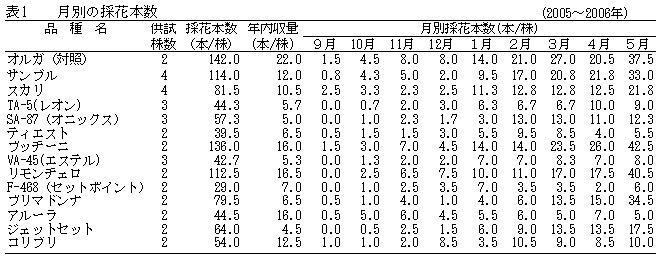 - 新品種の特性調査から、1株当たりの年間採花本数が100本以上あり、年内採花本数が多く優品率の高い「プッチーニ」、「サンブル」を有望品種として選定した。