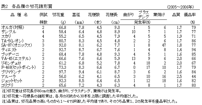 切花品質で、エステル(オレンジ色)及びサンブルは曲がりがやや多く見られ、リモンチェロ、セットポイント(濃赤)はブラスチングが多発する。優品率はティエスト、レオン(桃色)、プッチーニ、プリマドンナが特に高く、アルーラを除く全ての品種で65%以上である(表2)。