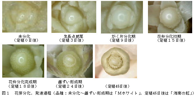 図1 花芽分化,発達過程(品種:未分化〜雌ずい形成期は「Mホワイト」,定植45日後は「湘南の虹」)