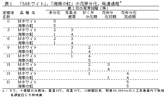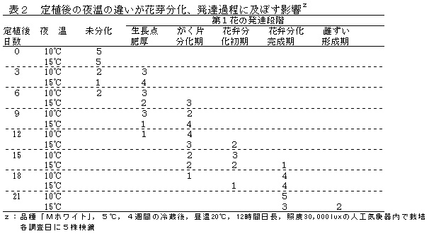表2 定植後の夜温の違いが花芽分化、発達過程に及ぼす影響Z