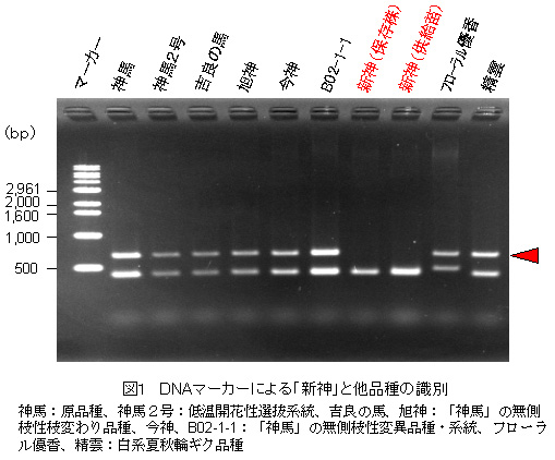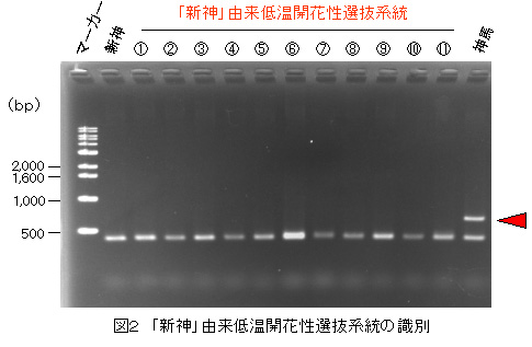 「新神」に再度イオンビームを照射し、低温開花性を付与した11選抜系統についても、「新神」と同様の増幅パターンを示しており(図2)、本DNAマーカーは、栄養繁殖や培養による増殖、さらには枝変わりも含めて、安定して保持されている。