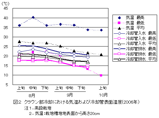 - 長さ15m、2条植の高設栽培槽において摂氏18.7±1.4度の水を冷却管(直径19mm鉄管)に毎時130リットル通水することで、8月から9月の冷却管の表面温度は最高で摂氏25.4度、平均で摂氏17〜21度程度となり、入水側と排水側の表面温度の差は最高で摂氏3.2度、平均で摂氏0.1〜1.4度となる(図1、図2)。